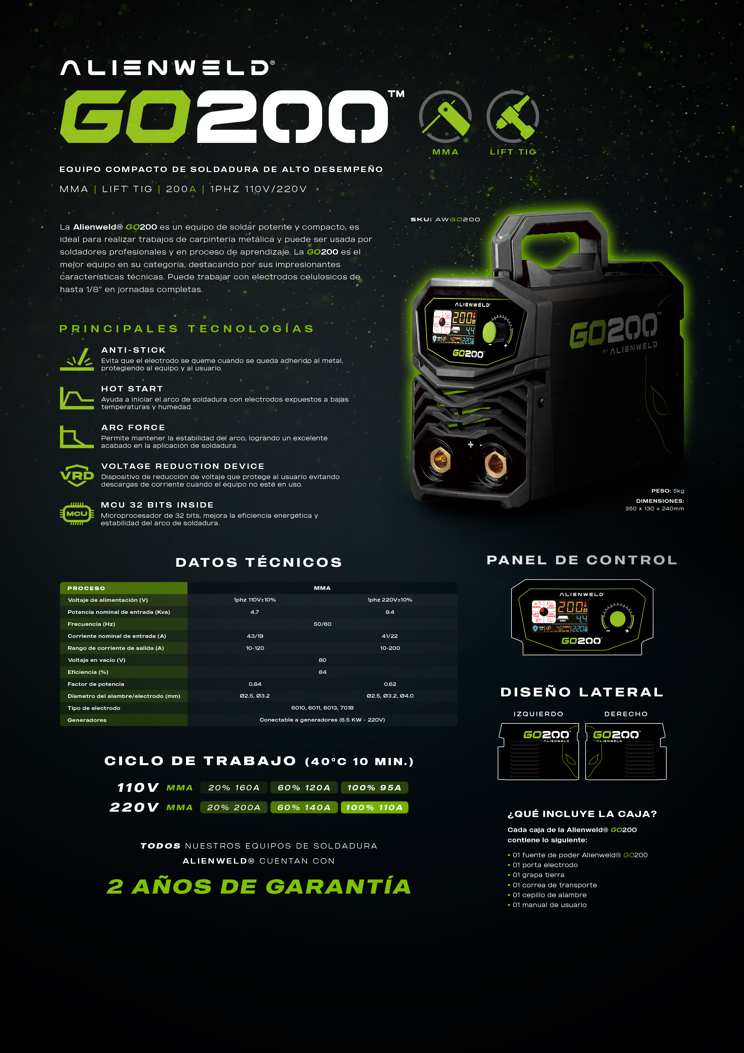 La Alienweld® GO200™ es un equipo de soldar potente y compacto hasta 200 AMP, es ideal para realizar trabajos de carpintería metálica y puede ser usada por soldadores profesionales y en proceso de aprendizaje. La GO200 es el mejor equipo en su categoría, destacando por sus impresionantes características técnicas. Puede trabajar con electrodos celulosicos de hasta 1/8” en jornadas completas.