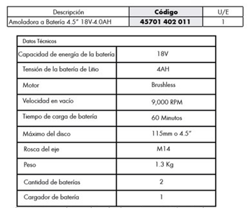 AMOLADORA A BATERIA 4,5" 18V 4,0AH WÜRTH HERRAMIENTAS