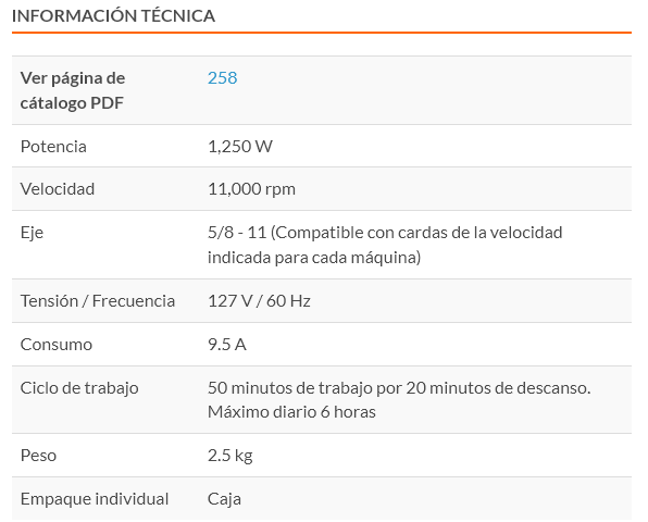 Motor de 1250 W, montado sobre balero de bolas para mayor vida útil y mejor desempeño