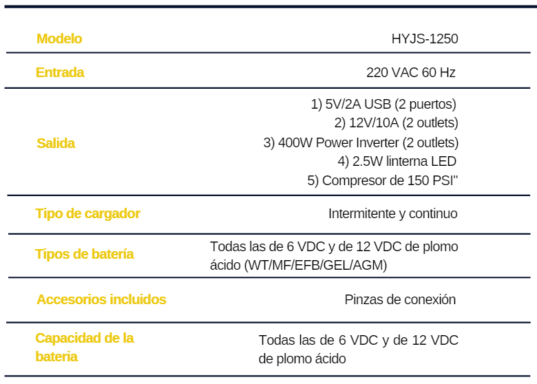 El Arrancador/Compresor HYJS1250 Hyundai, es una herramienta multifunción: infla neumáticos con la presión necesaria, arranca tu auto si tu batería no cuenta con carga suficiente, entrada USB para carga de tu dispositivo móvil, 2 salidas de 12V. De recarga fácil, solo se conecta a 220V y listo.- Capacidad 18Ah Batería de Plomo - Acido