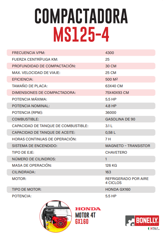 COMPACTADORA BONELLY GX160, compactadora de uso industrial, para trabajos pesados de construcción, adheridos a un motor Honda, hacen el complemento perfecto de todo trabajo de refracción de pistas y pavimentación.