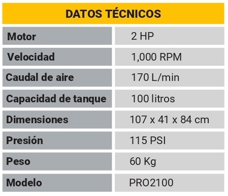 El compresor de aire Profesional PTK es una herramienta industrial para trabajos de máxima exigencia y diseñada para trabajos pesados. Su tanque de 100 litros hace que este equipo sea para aplicaciones de trabajo profesional como en talleres, fábricas, industrias y más.