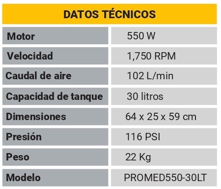 El compresor libre de aceite de 30 L es ideal para uso odontológico. Tiene un peso de 21 Kg y un tanque de 30 litros. Su velocidad es de 1,750 RPM y posee un caudal de aire 102 L/min. Todas las herramientas eléctricas, manuales y equipos PTK tienen un año de garantía gracias a su alto estándar de fabricación.
