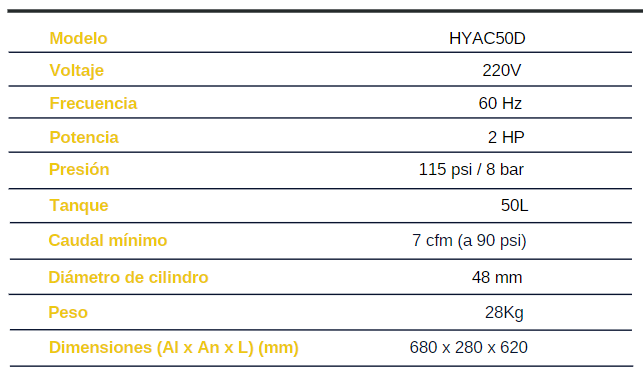 La Compresora HYAC50D de Hyundai de alta calidad, se encarga de suministrar aire comprimido y trabajar con máquinas afines con una potencia de 2 HP. Cuenta con válvula de seguridad sobre-presión, la cual evita que los gases y el aire se acumulen en el interior y produzcan algún tipo de accidente. Además, está protegido también en caso de sobrecalentamiento mediante una carcasa muy resistente.