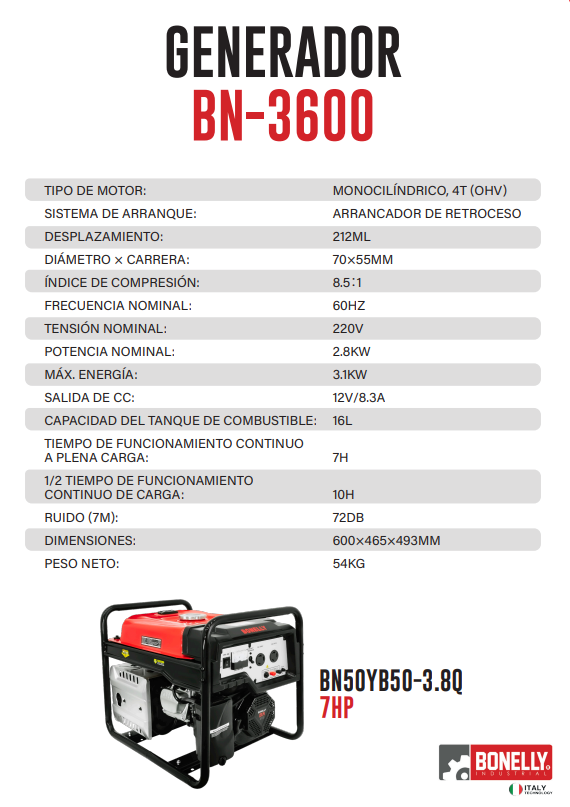 Generador gasolinero BN3600 2.8kw - Línea Premium Bonelly Generadores