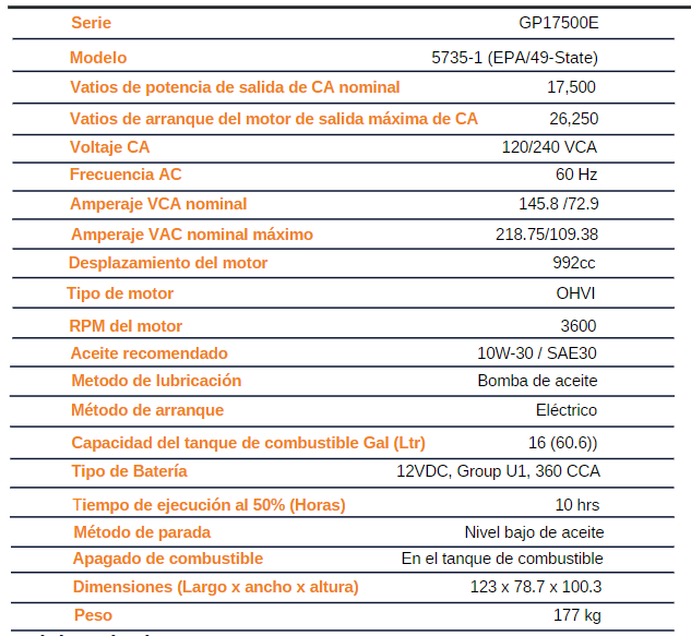GENERADOR PORTATIL 17.5KW ARRANQUE ELÉCTRICO A GASOLINA GP17500E GENERAC