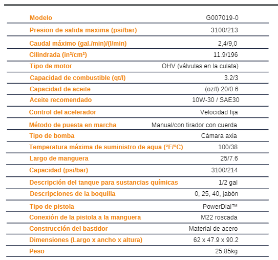 Utilizando un gran motor de eje horizontal de 196 cc, su bomba de leva axial proporciona una presión de hasta 3100 PSI (aproximadamente 52 veces más que una manguera de jardín estándar) y un caudal de hasta 2,4 GPM ( valores declarados por el fabricante ). Juntos, los valores dan como resultado un poder de limpieza de 7440 Unidades de limpieza .