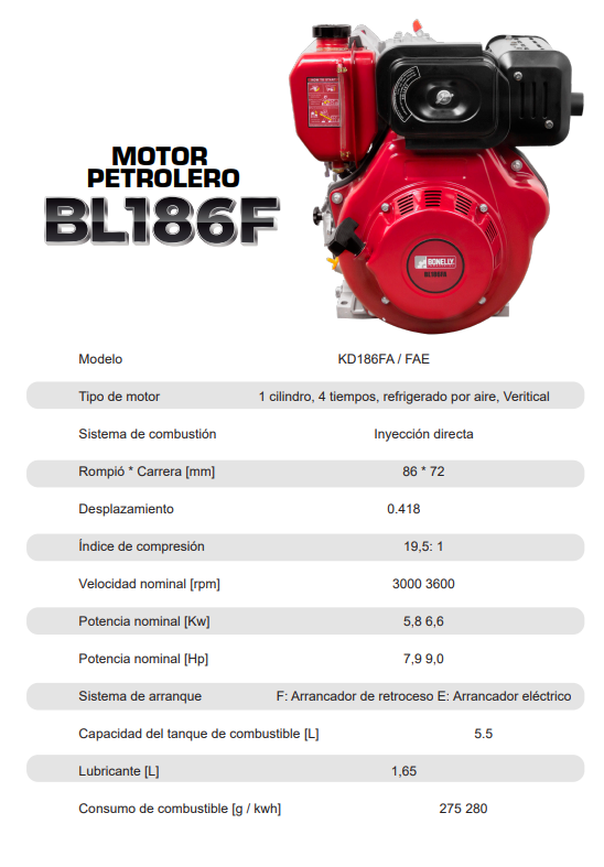 Motor Petrolero 10Hp electrico BL186FAE Bonelly Motores