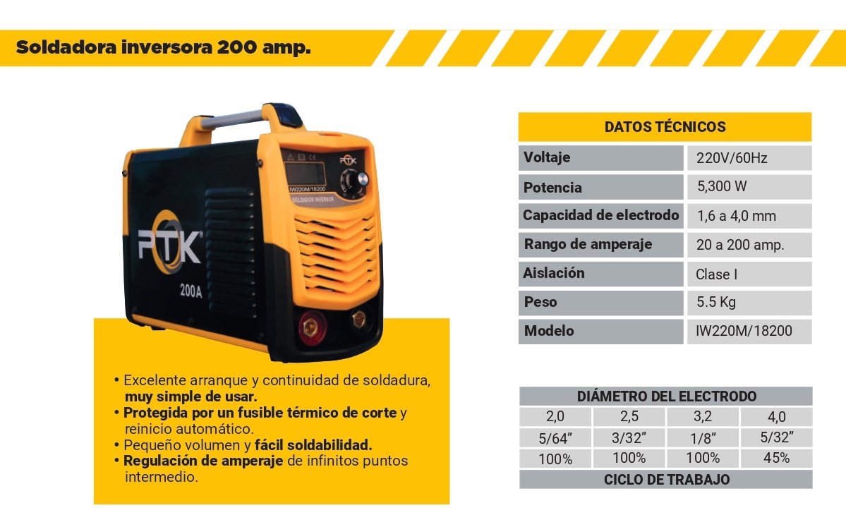 Soldadora inv 200A 5300W + Amoladora 4.5" PTK Promociones