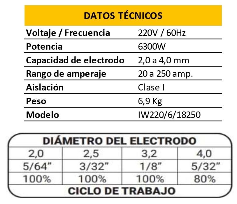 La Soldadora Inverter de 250 Amperios te ayudará en trabajos de gran exigencia e inclusive en lugares difíciles, ya que es un equipo liviano (peso 6.9 Kg) y compacto, puede ser transportado con gran facilidad. Con una potencia de 6300W y 250 amperios, puede soldar con electrodos de hasta 4mm. La soldadora de 250 Amperios te ayudará a realizar trabajos de forma rápida y eficazmente logrando un excelente acabado y rendimiento. Es de bajo consumo eléctrico ya se trata de un equipo Inverter. Equipada con un display digital para regular de forma fácil y cómoda el Amperaje de la máquina. Es Turbo Ventilada lo cual aumenta su rendimiento, está protegida con un Fusible Térmico diseñado para trabajos de larga duración, el cual protege la máquina de altas temperaturas.
