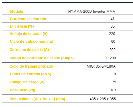 - HYMMA-200D Inverter MMA, pequeña, ligera y compacta, para trabajos semiprofesionales