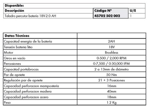 TALADRO PERCUTOR A BATERIA 18V 2,0AH WÜRTH
