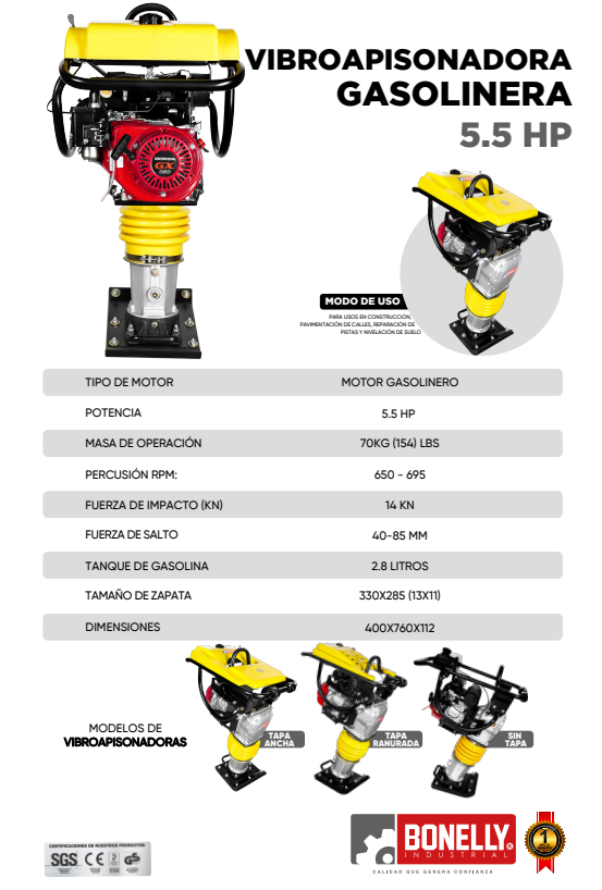 Vibroapisonadoras Bonelly, desarrolladas para trabajos pesados de pavimentación, construcción. Fácil de transportar a diferentes áreas de la pavimentación de la obra, potente motor Honda de 5.5 Hp con una refrigeración por aire, que permite el trabajo constante del motor, haciendo que la fuerza de impacto sobre la masa sea uniforme. Nuestras Vibroapisonadoras cuentan con calidad internacional, debido a sus altos estándares de fabricación.